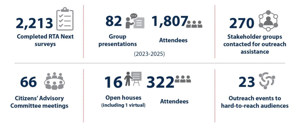 From public meetings, open houses, pop-up events, 150+ submitted comments, surveys and continuing calls for comment, the public was able to participate and review draft plans at every stage of the process. The RTA Board considered public input in developing the final $2.67 billion plan for voter consideration next March.