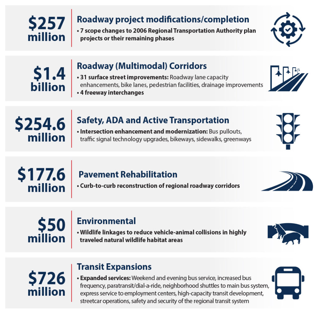 - 31 surface street improvements: Roadway lane capacity enhancements, bike lanes, pedestrian facilities, drainage improvements